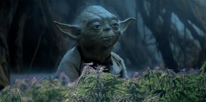 Star Wars-themed marijuana tends to lean heavily on the Indica side of the breed spectrum: relaxing, dreamy ladders that climb past the clouds to what Permanent Midnight’s Jerry Stahl referred to as Uncle Snoozy’s House. Out of all of these tranquil strains, it is Bubba Fett that is the trankest of the trank danks. This cross between Stardawg and a pre-1998 cut of Bubba Kush will give the sensation of being inside a glass globe floating on a sea of rain. What better way to enhance that than with Episode II: Attack of The Clones trip to Boba Fett’s home planet Kamino, a storm-swept world where everything looks like wet mirrored sunglasses. Consciousness becomes optional in this turn of the century middle chapter as the Bubba Fett gets you out of the plotline and into the visual waves of the picture until the big punch out at the end.