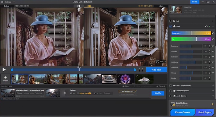 Color Adjustment: Faded tones, uneven exposure, or yellowed footage can be restored. Aiarty Video Enhancer enhances color temperature, tint, saturation, and contrast etc, giving new life to archival material while respecting its original aesthetic.