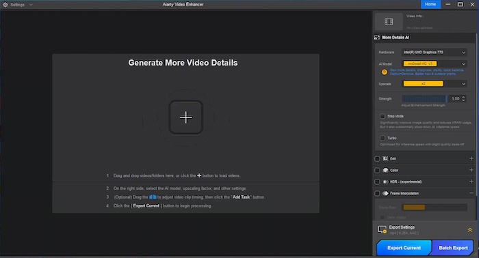 Drag and drop your film scans, VHS transfers, MiniDV captures, or public-domain clips. Aiarty supports a wide range of formats and allows batch processing.