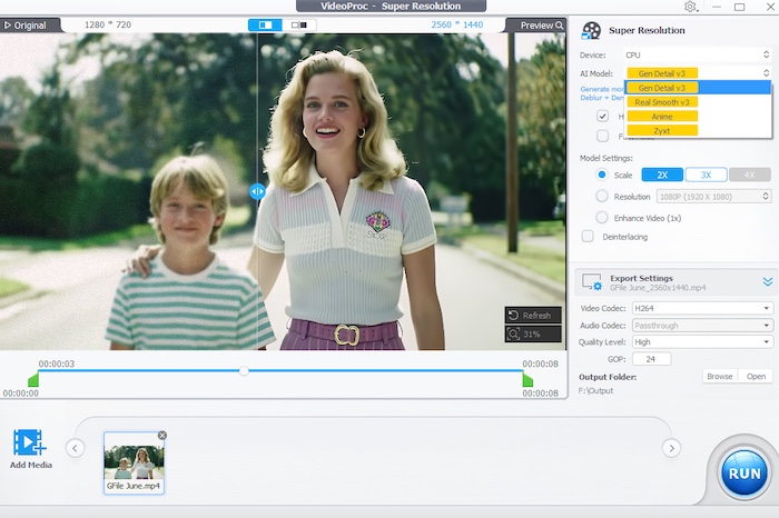 VideoProc Converter AI’s AI Super Resolution uses advanced AI to upscale videos up to 4x their original resolution, achieving resolutions up to 4K. It’s more than just pixel stretching. The AI intelligently analyzes and enhances details – skin, fabrics, faces, edges – while reducing visual imperfections like noise and blur. The result? Old, low-res footage that looks surprisingly sharp and vivid, even on today’s ultra-high-def screens.