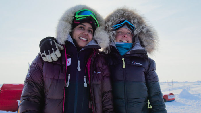 Sheikha Asma Al Thani and Ida Olsson celebrate the trek. Photo by Powderkeg Studios