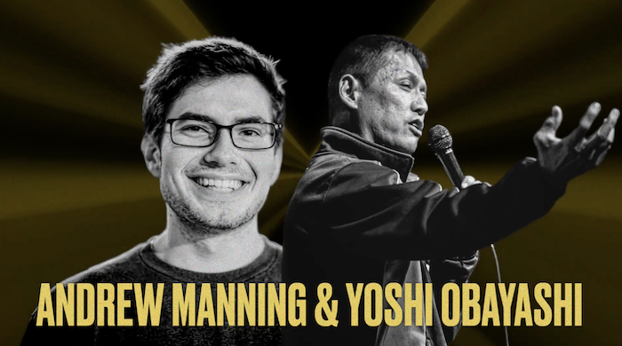 Comedians Yoshi Obayashi and Andrew Manning co-host the 7th Annual Award This! event.