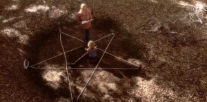 “Travelling to the spot where Lucifer fell to Earth, the two make a pentagram on the ground, and Oralee reads from a grimoire.”