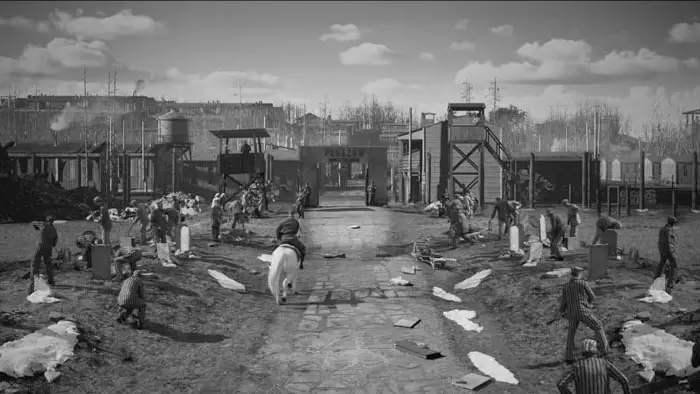 Joseph Bau (Emile Hirsch) sees the world in a slightly different way from everyone else. His unique perspective enables him to maintain an upbeat attitude, even while crammed into a single room with his mother, father, and others in the ghetto of Kraków. Unfortunately, it isn’t long before Joseph and his family are rounded up and sent to the Płaszów concentration camp in 1942. Due to his artistic background, Kommendant Goeth (Josh Blacker) enlists him to be the mapmaker, allowing troop movements and the like to be tracked. This gets under the skin of Franz Gruen (Yan Tual), who seethes with hatred for Joseph.