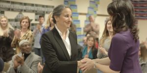 And it is a vast army of characters in Courting Des Moines that rivals such epics as the Mahabharata. The synopsis tells us it’s about a disgraced congresswoman returning home after a scandal, which just happens to coincide with the presidential caucus. But her story is abandoned almost immediately so we can meet a newsman hungry for a scoop, a retired general without a filter, a local politician grinding away at his job, his daughter who is a lawyer, another local politician who decides to run after meeting, a New York politician who appears to be made up of everything negative thing ever said about Hillary Clinton. And that isn’t even scratching the surface. Characters are introduced and then almost immediately abandoned. If a character is very lucky they get one or two scenes of “character development” and then are quickly forgotten. The congresswoman, this whole movie is supposed to be about, is abandoned in the third act in favor of her staff and random people on the street. Without a clear dramatic focus Courting Des Moines wanders the Iowa country side looking for something to say, and never quite finding it.