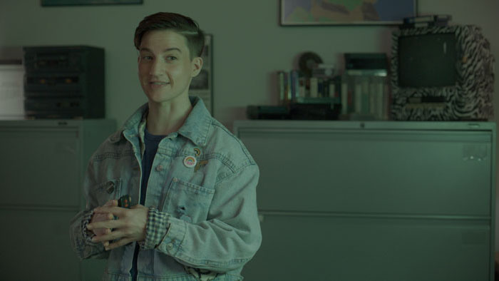 The use of narrative inserts is not how things usually go in a documentary. Maybe it should be done more often, as it works brilliantly. The wraparound fulfills a purpose that goes much further than education. Yes, the storyline gives context in which a lot of historical information is conveyed, but it also creates a reflective plane for the viewer to exist within. Germaine shows a much wider emotional range than we have seen from them before, as they played it cool as ice in the slasher They/Them.