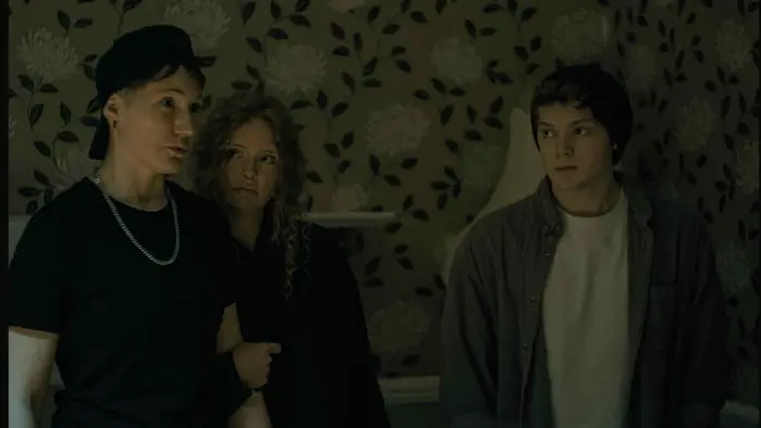 The rules of the game are simple. The blind man instructs them to sit together at a table, hold hands, and wait for three knocks. After the third knock, an unseen entity (Megan Murphy) will arrive, and they must keep their eyes closed until morning. Easy peasy. Should anyone open their eyes, they will face swift and deadly consequences. As the instructions sink in, fear builds among the teens, especially since Harris, being deaf, cannot hear the knocks or the entity’s presence. With dread hanging in the air, the game begins.