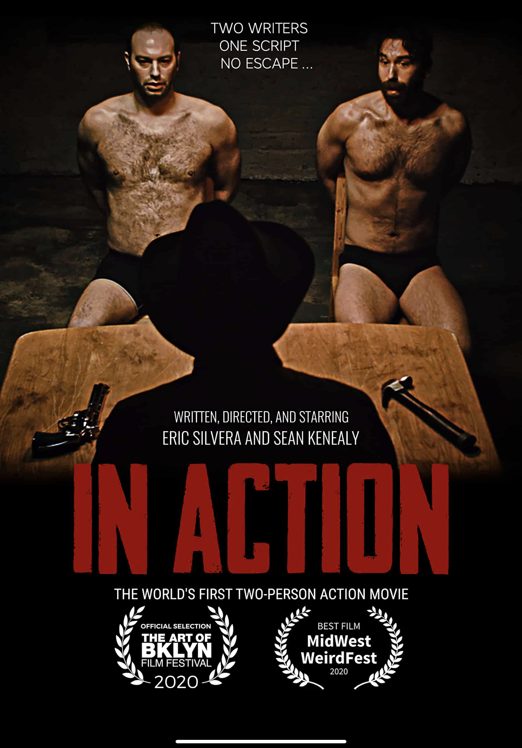 How hard is it to be a screenwriter in Hollywood? Pretty damn hard… and dangerous. That’s our two protagonists’ experience in Sean Kenealy and Eric Silvera’s comedy/thriller In Action. The film opens with Sean and Eric tied up in a darkened room about to be filleted by a dark, mysterious character, and then we flash forward to the duo sitting on a couch recounting the entire story.