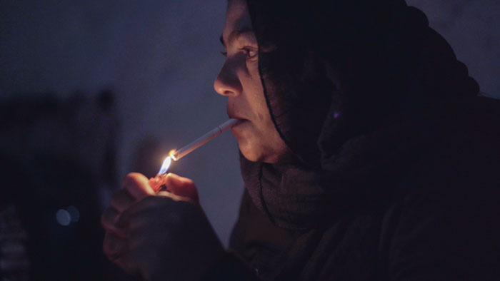 Rabia (39) lights a cigarette as the electricity cuts out on her home in Sabra.