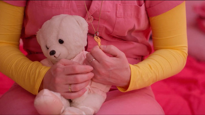 Beatrice (Teresa Catherine) takes a solitary road trip through the mountains. She sings along to the radio, with a teddy bear on her dashboard and a key hanging from the rearview mirror. She parks in an empty lot surrounded by nature’s beauty and carries the bear and the key to a mysterious shed. Inside, bathed in magenta light, she finds a lone door standing in the middle of the shed. Unlocking it transports her into a lavish, pink bedroom where a young girl (Sloane Cherry) waits.