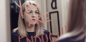 The loner Celeste (Bethany Watson) is isolated in her apartment, and the idea of “Getting out there” and finding love is a significant undertaking toward personal growth. Lonely Hearts opens with the words “You Are Enough” written in lipstick on her mirror, serving as her daily affirmation. We then slowly pan to her sitting on her bed, listening to a tape of a motivational speaker asking Celeste if she’s a snowcap or a mountain.