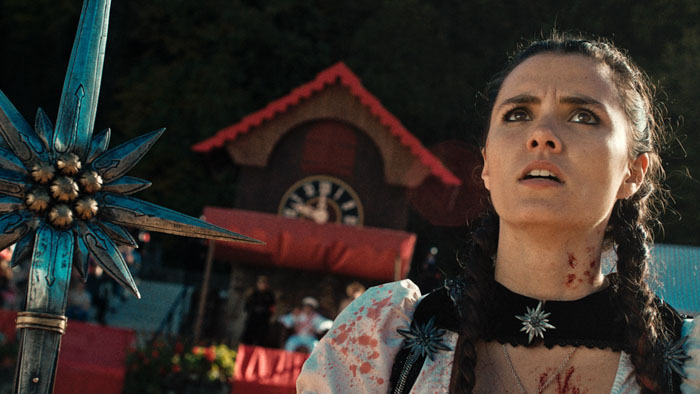 Mad Heidi is nothing if not ambitious. The filmmakers put the approximately $3 million they raised to excellent use, as everything goes for broke. The opening features a billboard that says, “Strength through cheese.” While it is a little moment, nothing more than a quick establishing shot, it highlights the team’s dedication to world-building and remarkably silly humor. It also instantly brings the totalitarian regime’s propaganda into focus. An actual second into the movie proper and all that is already on display. That is talent and dedication to a vision at its finest.