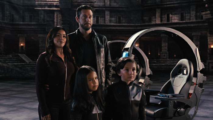 Spy Kids: Armageddon. (L-R) Gina Rodriguez as Nora Torrez, Zachary Levi as Terrence Torrez, Everly Carganilla as Patty Torrez and Connor Esterson as Tony Torrez in Spy Kids: Armageddon. Cr. Netflix ©2023