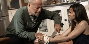 Enter Jamie and Matty (Shea Buckner and Tyler Jon Olson), criminal brothers on the run from a burglary, and a subsequent gas station shooting where Matty took a bullet in his leg. Fleeing the scene, the two reluctantly concede to seek treatment for Matty’s wound at Rich’s clinic, of course. Once inside the clinic, all Jamie has to do is overhear Rich say something vaguely medical-like to another doctor, and, rather than risk identification, decide that he and Matty should follow Rich home and force the doctor to patch up Matty. But this is an action movie with Bruce Willis, so…