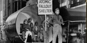 “Well, I guess there’s nothing for us to worry about. We’re the ones that have the bomb,” says an actor in one of the many clips of political morality plays that make up the absurdity of The Atomic Cafe. The redundant message in nearly all the newsreels was simply not to worry, yet be prepared with measures such as the classic “Duck and Cover” maneuver or a well-stocked fallout shelter. In one clip, a head-to-toe lead suit is modeled by a young boy. Resembling a life-size oven mitt, the happy tike hops onto his bike and demonstrates how easy going to school would be despite the nuclear fallout.