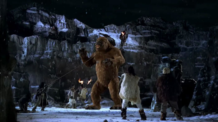 However, all of those good elements take a backseat to the true star, the point of the picture: David Allen and Chris Endicott’s (and a slew of others) stop-motion creature effects. Little time is wasted in showing off, as the yeti is seen in all its glory five minutes in. Admittedly, the ensuing setup and expedition to the mysterious land of the reptilians is free from the impressive mayhem. But once the sun-scorched territory is established, very few scenes take place without something visually masterful taking place. All the reptilians look distinct and move believably. The level of detail in even the tiniest of movements can be seen during a gladiatorial combat sequence, which proves to be the climax, both story-wise and artistically speaking. The crowning achievement of Allen’s special effects is the yeti. The design allows an impressive emotional range, with expressive facial movements and telling body language. In the combat arena, the yeti goes from playful curiosity to murderous rage in one shot. It is the best acting in the entire 91-minute runtime.