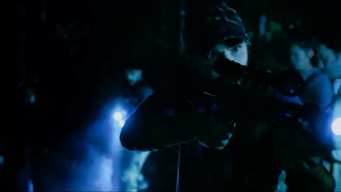 Writer/director/star Garrett Schulte’s feature debut is a labor of love called The Sky’s Forest. It is a science fiction/horror film with a creature and a message. Jasmine (Omalolu Fiki) is an ambitious astronomer, but she gets iced out of the official team studying a new meteor shower she discovered. She travels to a friend’s cabin, where there is less light pollution, to observe the celestial phenomenon. When a meteorite crashes in the forest, Jasmine wants to go examine it. As the group prepares to accompany her, Dax(Schulte) and Chuck (David Price) bring AR-15 style rifles, ostensibly for defense against bears. Jasmine comments that it’s overkill, and she is not wrong.