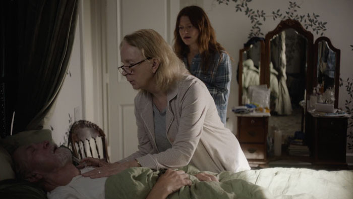 Megan (Colby Minifie) returns home to help her resentful mom, Barbara (Kate Burton), take care of ailing patriarch Robert (Vaughn Armstrong). Soon, Megan discovers there’s something wrong with mom, something way darker than bitterness over her daughter’s recent absence. Megan discovers teeth in a little sack. Barbara resorts to voodoo, like tearing out chunks of her hair, instead of giving her husband the correct morphine dosage. When he finally passes away, Barbara wants to “bring Robert back.” “From where?” Megan asks.