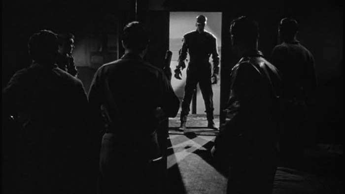 Lastly, the monster is simply a guy (James Arness) in a suit. Nyby and Hawks make every attempt with lighting and camera angles to make the monster feel real, knowing that exposing the man-in-the-suit would be death to the story and additional fodder for MST3K. Despite its low budget, the infamous disembodied animated hand is pretty creepy. Also, the lighting is just not dark enough, and at this time, it was impossible to go pitch black without the film becoming a series of black frames of sound. The need to have an image on the screen sacrifices any genuine attempt at the “horror lurking in the darkness.”