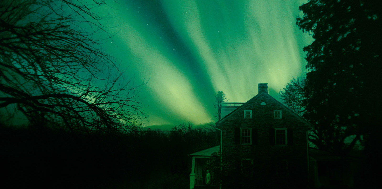 Many decades later, Father Douglas (Sean O’Bryan) is giving the last rites to a dying elderly woman (Carol Chromicky) while her daughter, Gloria (Kathy Becker), sits by her side. Comforted by the priest’s demeanor, Gloria asks Father Douglas if he would reconsider retiring, but he feels too old for the job. Douglas lives alone in his old house out in the woods, acres away from anyone. One night, the sky is filled with the same green glow as the Aurora Borealis, like the night so many years ago. All the power in Douglas’s house goes out, and his phone stops working. He then hears a knocking. On the doorstep is a terrified Amish woman who says she isn’t in the right place. Douglas tries to help the woman, who says her name is Hannah, as she is bruised and bleeding. When Douglas tries to light a candle, Hannah blows it out for fear of being found.