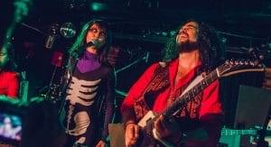 The HH lineup includes Kevin, who’s a little embarrassed to admit that his day job is playing a drug dealer on Days of Our Lives, and Tomoki, who hails from Tokyo and started out as a Man Man super fan. She was later promoted to her current role as a Honus Honus backup singer. She’s a bundle of energy who hops around on stage in a skeleton costume as if doing an aerobic workout, and clearly is having a blast.