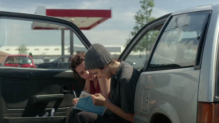 The other track of Vagabondes follows the lives of Jo (Pauline Bression), Faustine (Aurélie Reinhorn), and Miloud (Sacha Bourdo), who live in the parking lot of a big box store. Jo lives in her car, which broke down here two years ago. Miloud is an older man with mental illness who claims a drafty shed on the property for himself. Faustine is a young woman of means, a writer who fancies herself light in the “life experience” department. In the interest of improving her writing, she decides to live with the homeless for a space of time, hoping to give herself some emotional depth from experiencing those hard miles. It’s an incredibly stupid, tone-deaf affectation that could only originate in clueless privilege.