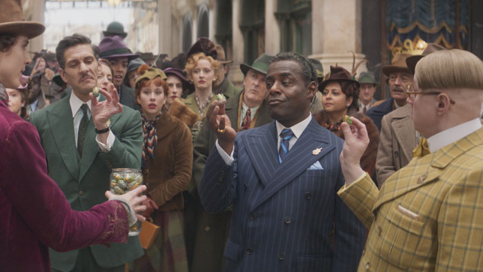 Wonka feels like what you’d get if Monty Python did a stage production of Annie juxtaposed with Oliver and Mary Poppins with a side of Little Britain. Matt Lucas, star of the latter show, plays one of the villainous chocolate cartel members. Hugh Grant plays the grumpy, put-upon Oompa Loompa. There’s also a giraffe named Abigail, and a chocoholic priest played by Rowan Atkinson, just to name a few of the many fun surprises. It’s an industrial-revolution-inspired campy romp.