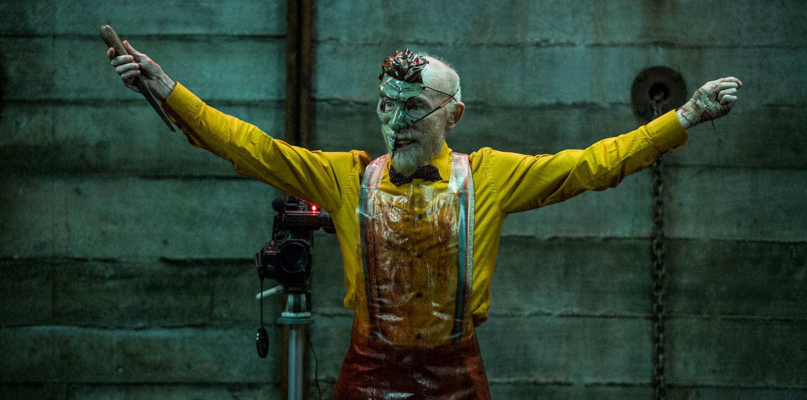 “Do you want to play a game?” When the four amigos wake, they find themselves shackled with neck braces and heavy chains inside some sort of industrial building. And none of them know how they got there. Sound familiar? While there are no puppets on tricycles handing out tasks, and no man in a robe complaining about his late mortgage payments, there actually is a game to be played. The forgetful four are eventually greeted by The Host (Jackie Earle Haley), a gruesome but silly game show host dressed in a suit of loud colors and a theme of infinite jest. He wears a half-mask in a similar fashion to The Phantom of the Opera. But the phantom of this opera has a lot more to hold a grudge over than his face.